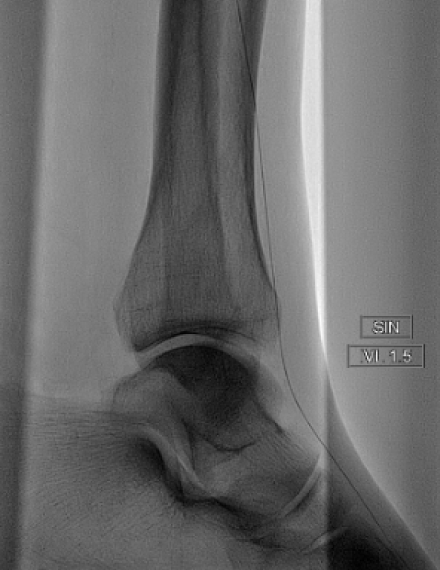 Baseline angio shows a total occlusion of the anterior tibial artery (ATA), with a diffuse lesion of 30 cm length. Ankle-brachial index (ABI) pre procedure: 0.30. -