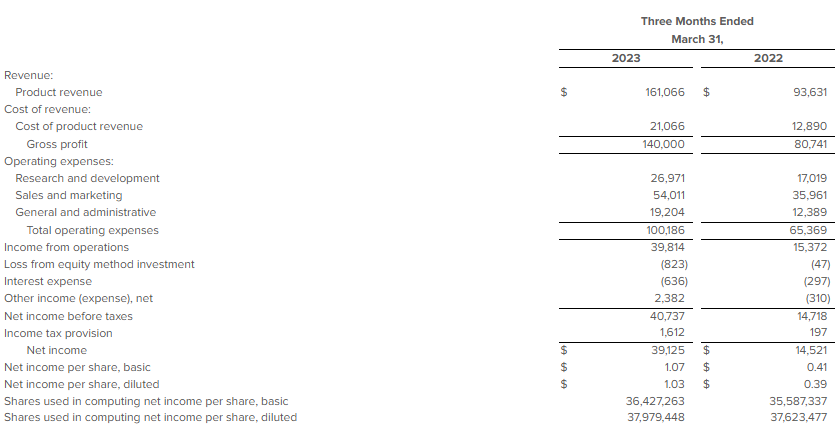 Gross profit for the first quarter of 2023 was $140.0 million compared to $80.7 million for the first quarter of 2022. Gross margin for the first quarter of 2023 was 87%, as compared to 86% in the first quarter of 2022. The increase in gross margin was primarily driven by product mix in addition to continued improvement in manufacturing productivity and process efficiencies.