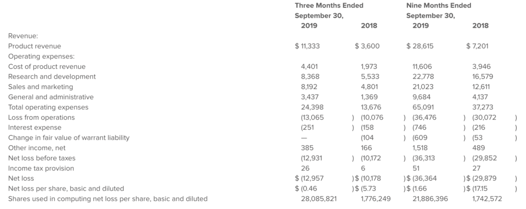 Revenue for the third quarter of 2019 was $11.3 million, an increase of $7.7 million, or 215%, compared to the third quarter of 2018. The growth was primarily driven by the expansion of the U.S. salesforce and international distributor network.
